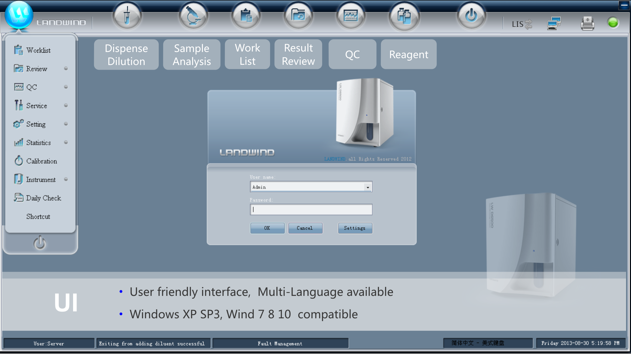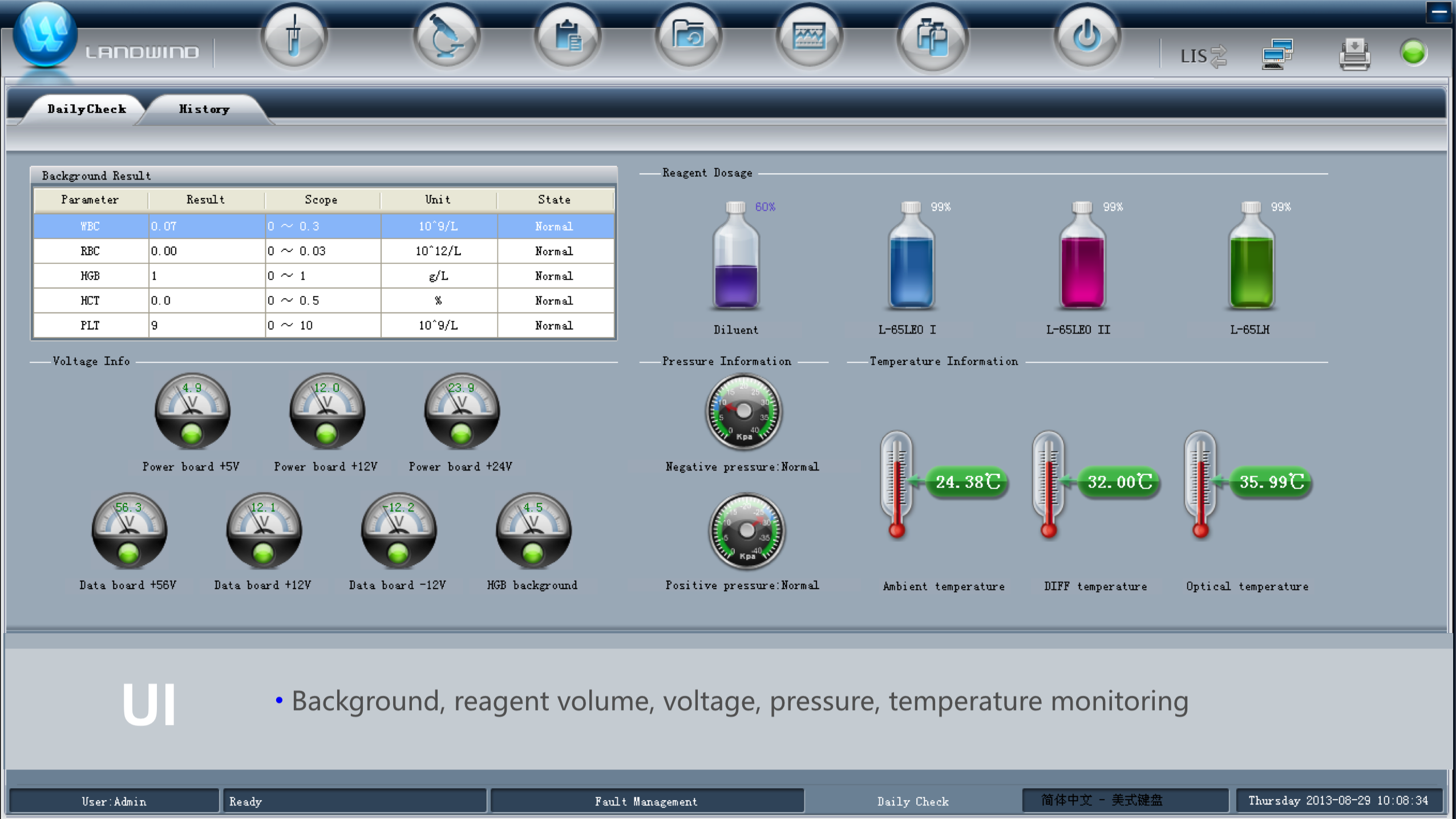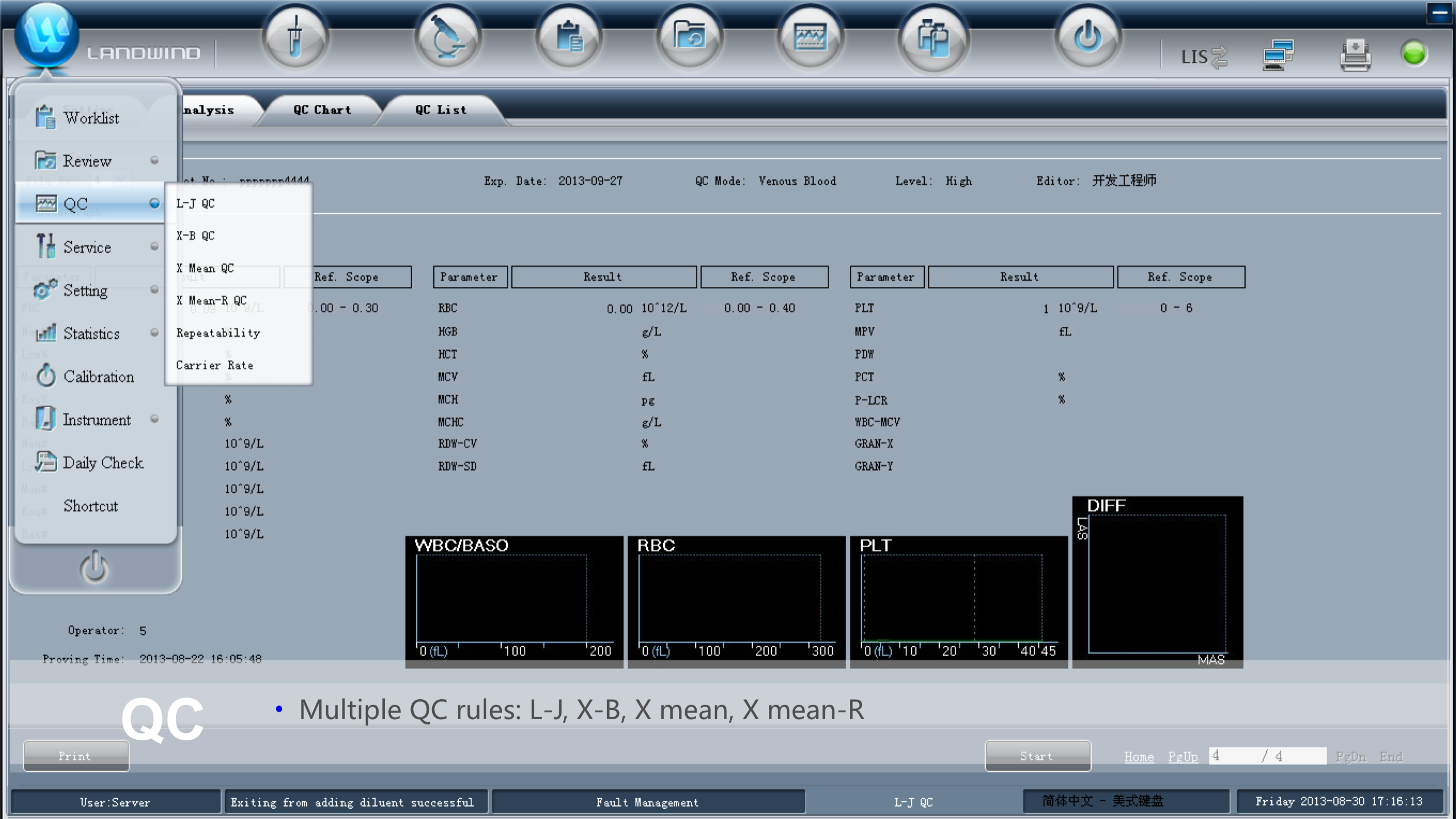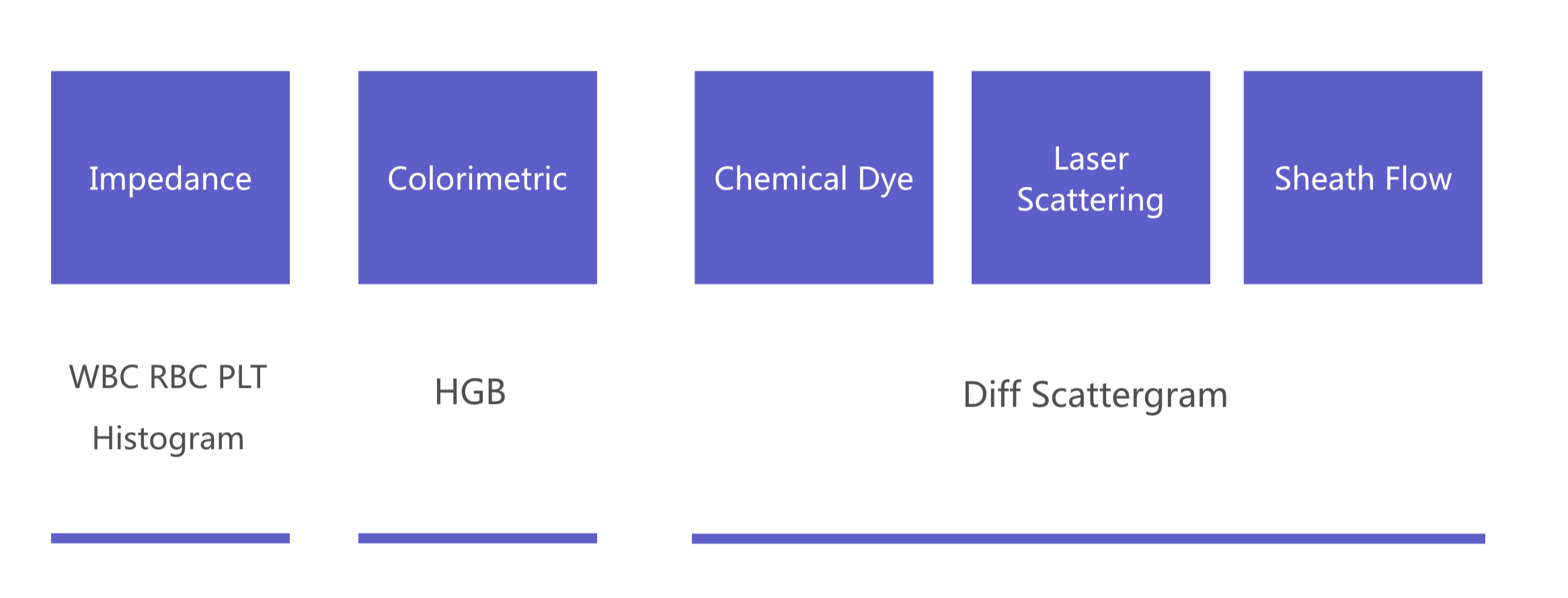 • Semiconductor laser flow cytometric analysis + cytochemical dyeing method (WBC+5DIFF ), automatic pulse resistance method ( WBC/RBC/PLT )